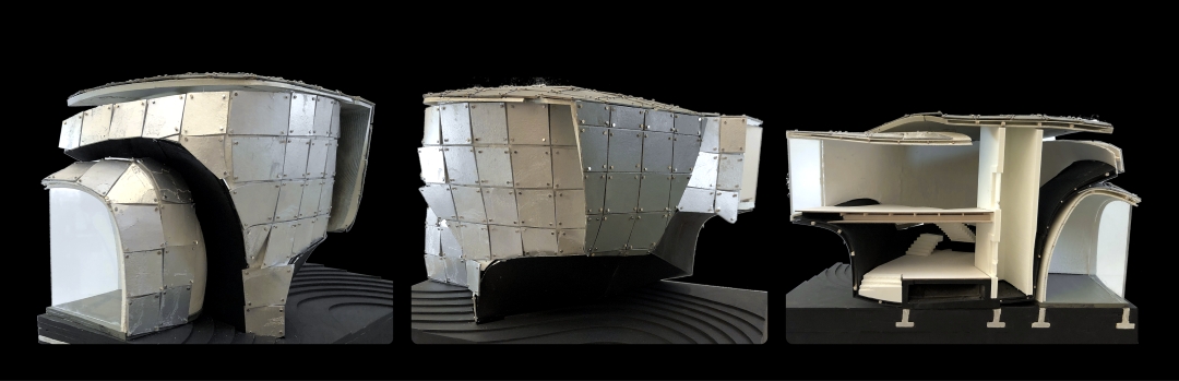As a piece of architecture, the museum integrates itself with the surrounding landscape in ways that are not immediately, physically apparent. A monolithic, metallic collection of forms, the museum appears foreign, like an object that could exist anywhere in the world. The structure exists as it is because of the specific site’s landscape. Land that is carved away to create a passage beneath the museum manifests itself in the circulation of the museum, ascending and descending from a brief peak. The museum interior becomes a continuation of what the landscape used to be, while the landscape itself has been reshaped, defined by its previous form.